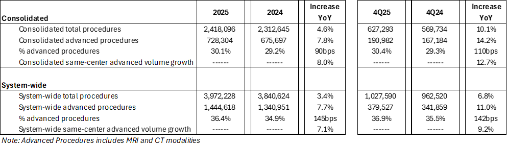 We also made progress in our service line expansion strategies, focusing on our continued opportunity in PET imaging and other clinical innovations. Full year PET volumes increased 17.0% on a consolidated basis and 13.5% on a systemwide basis, supported by expanding adoption of radiopharmaceuticals for enhanced detection of prostate cancer and amyloid plaques associated with dementia.
