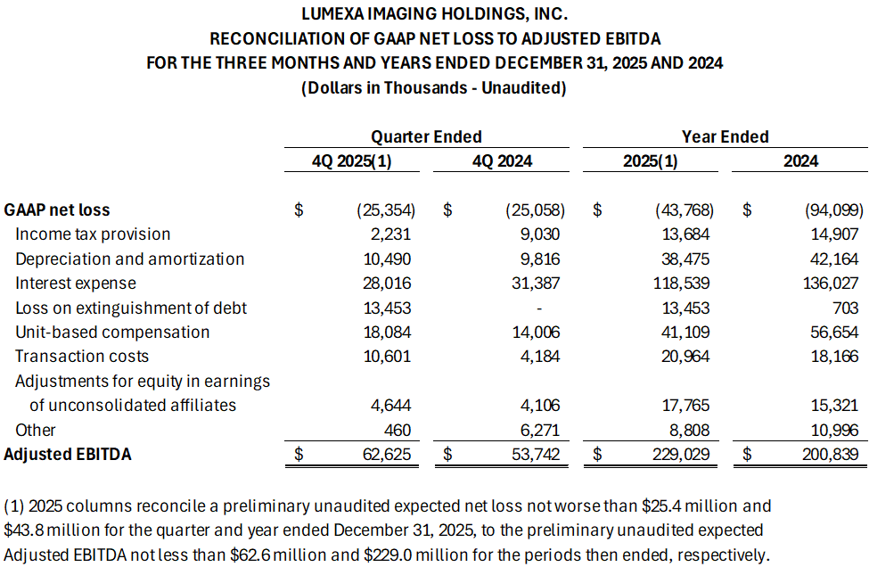 - Adjusted EBITDA of $234 to $242 million, which includes approximately $7 million of public company costs that were not incurred in 2025. At the midpoint, the addition of these costs in Lumexa Imaging’s first full year of operations as a company with publicly traded securities lowers Adjusted EBITDA growth for 2026 versus 2025 from 7% to 4%